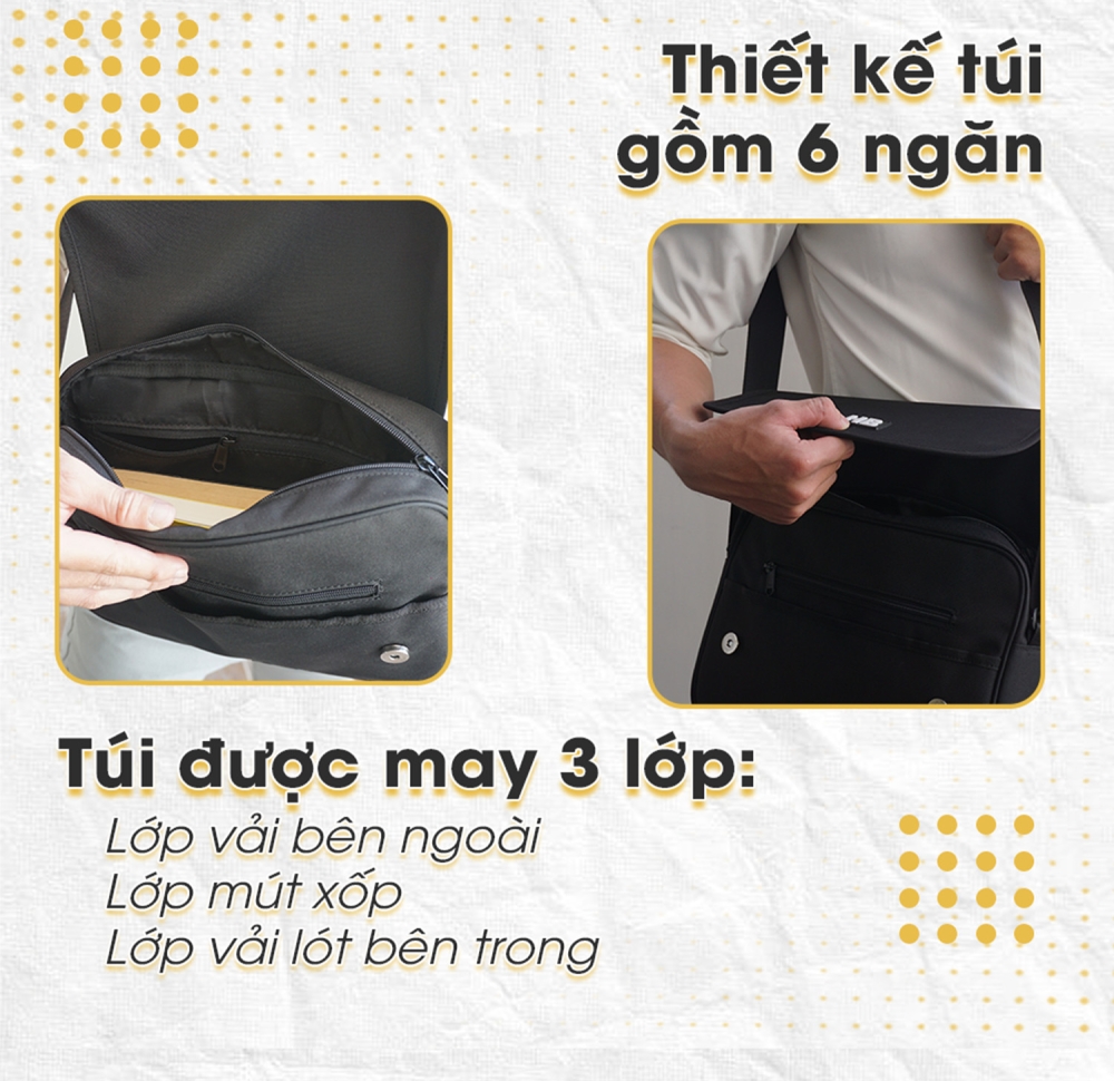 . THÔNG TIN SẢN PHẨM - Chất liệu: Vải bố 900 xí nghiệp ( vải nhập korean ) nhập khẩu chống thấm nước - Kích thước: 28 x 22 x 8 cm - Để vừa tất cả các dòng Ipad mini, Smartphone, sổ tay, ví, sạc.. - 1 ngăn lớn + 5 ngăn nhỏ - Màu sắc :Đen